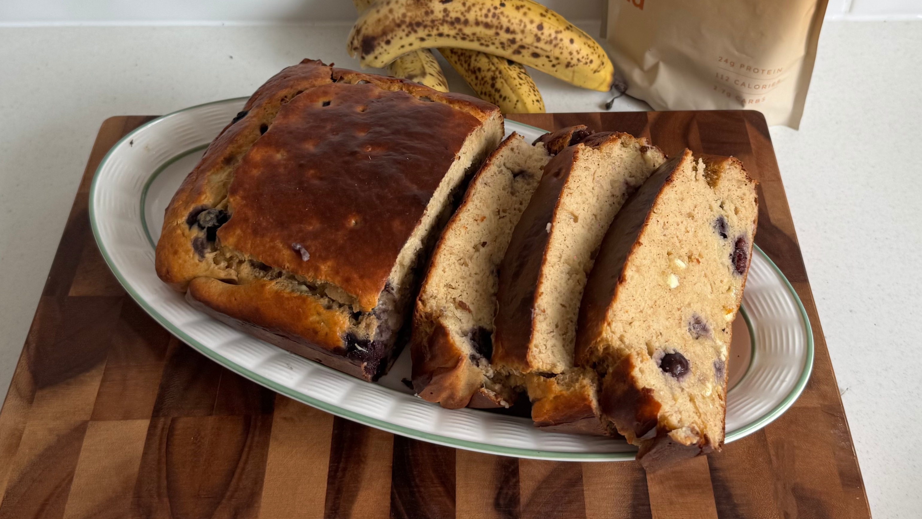Enjoy a soft, high-protein Homemade Blueberry & White Choc Banana Bread packed with banana, blueberries and white chocolate. Perfect for breakfast, snacks or post-workout fuel.