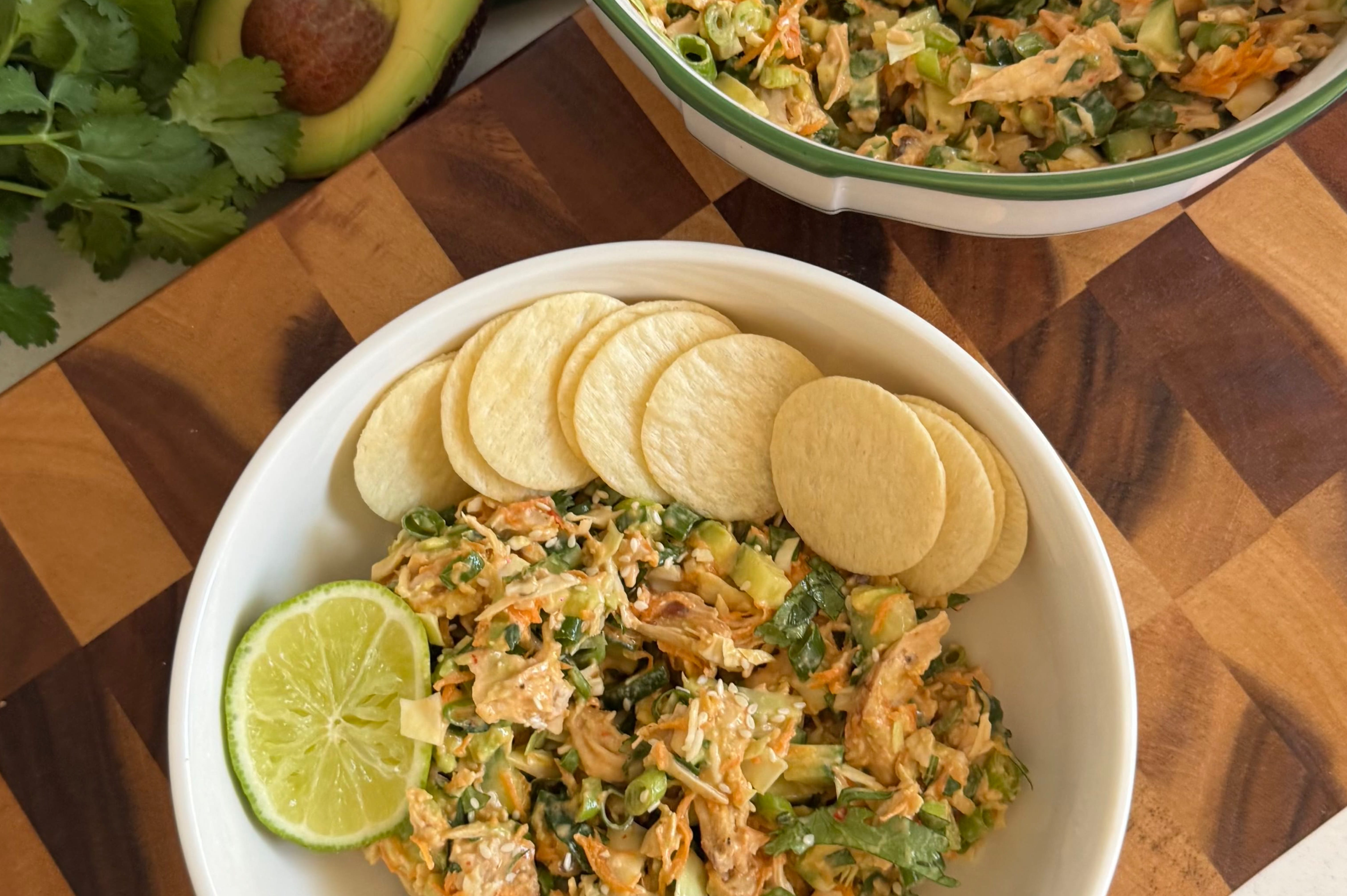 Enjoy this Lazy Bang Bang Chicken Salad packed with protein, crisp vegetables, avocado, and rice crackers. Quick, flavourful, and perfect for lunches or light dinners.